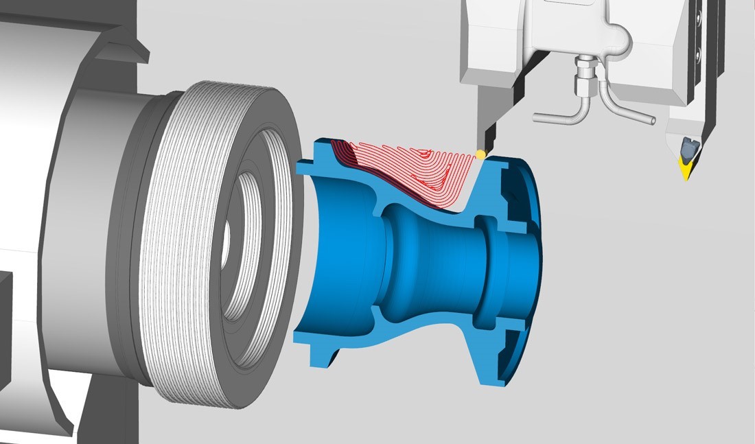 ESPRIT en tournage offre une grande possibilité de programmation avec les cycles en 2 axes (ebauche, contournage, gorge, filetage, perçage, tronçonnage, etc ...). Gestion en fraisage axe C, axe Y et axe B en continus et positionnés. Fraisage de formes (ébauche Z, finition Z constant, entre courbes, paramétrique, etc ...) en continu 5 axes (composite,en roulant, contournage, impeller, canal, turbine, etc ...).